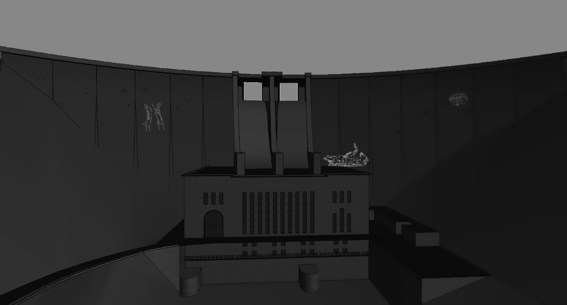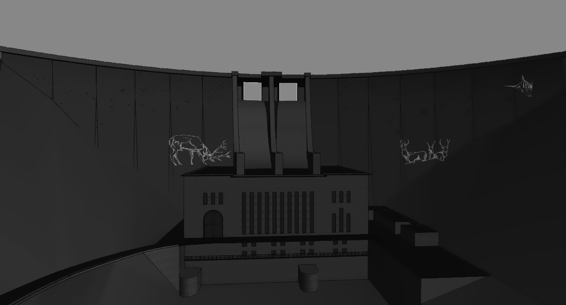 Le dessin animé en blanc sur le fond noir du barrage évoluera aussi bien sur la partie Est que Ouest. La narration se fait au fur à mesure des déplacements du dessin animé sur la paroi.